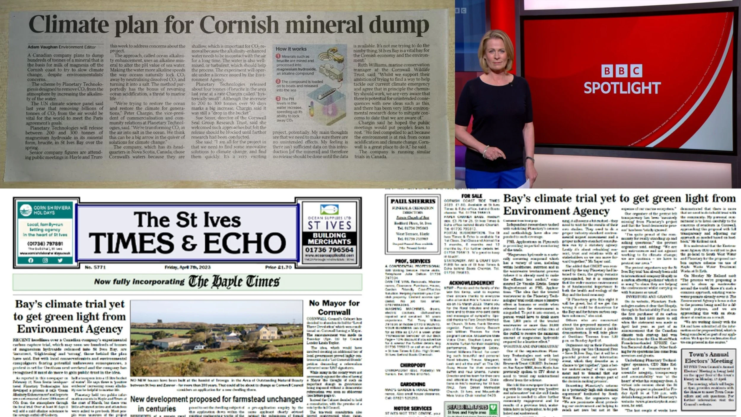On 19/01/23, SRT were present at a routine Cornwall Marine Liaison Group meeting where a Canadian startup company Planetary Technologies (PT) presented their plans for a Carbon Dioxide Removal (CDR) Ocean Alkalinity Enhancement (OAE) geoengineering project that would see tonnes of Magnesium Hydroxide (MH) released into St Ives Bay. SRT later learned that an initial trial took place in September 2022 that local communities and the public were not informed about.