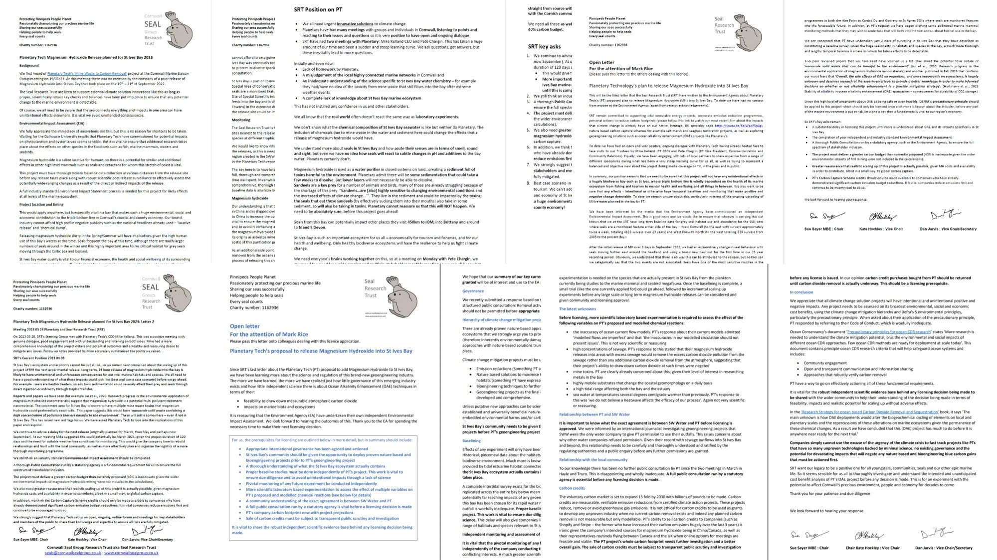 Given PT had already, and planned to again use South West Water’s (SWW) infrastructure, SRT engaged directly with SWW to share our growing concerns about the unknown status of impacts of PT’s project on marine ecosystems and to best help SWW conduct their effective due diligence duties on behalf of their shareholders and the SWW community. SWW’s CEO requested a meeting with SRT which was held on 29/11/23. Present at the online meeting were John Halsall (Pennon’s Chief Operating Officer) and two of his colleagues (Rebecca Bragg and Guy Doble), as well as SRT’s Director Sue Sayer MBE and Science Advisors Dr Ian Hendy (blue carbon and habitat restoration expert) and David Santillo (Greenpeace International’s geoengineering expert). A second meeting was held between SRT and SWW in early February 2024 and a third one planned. At these meetings SRT aim to help SWW to consider a wide range of issues associated with PT’s planned experiment to help their board make informed decisions.